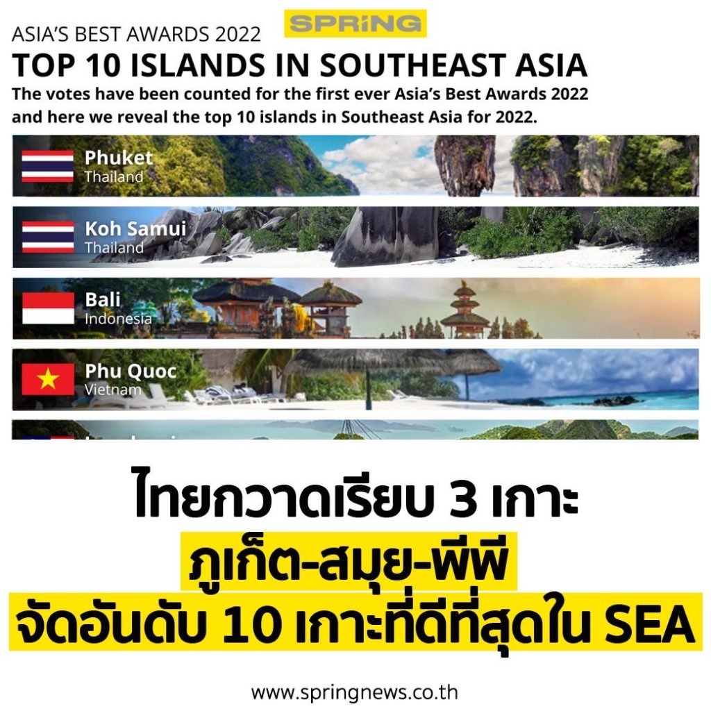 ไม่เพียงแต่เกาะภูเก็ตเท่านั้น ที่ได้ความรางวัลไปครองในปีนี้ยังมีเกาะสมุย ในจังหวัดสุราษฎร์ธานี และเกาะพีพี ในจังหวัดกระบี่ยังได้คว้ารางวัล อันดับ 9 จาก Asia’s Best Award 2022 :: Top 10 island in Southeast Asia ด้วย เรียกได้ว่าสร้างความภาคภูมิใจ และสร้างชื่อเสียงให้กับประเทศได้อย่างมากเลยทีเดียว