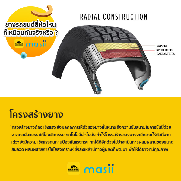 โครงสร้างยางครับ ทุกคนจะบอกว่าโครงสร้างยางต้องแข็งแรงแต่เพื่อนๆรู้ไหมครับการที่แข็งแรงนั่นอาจส่งผลต่อการให้ตัวของยางรถยนต์นั้นหมายถึงความขับสบายในการขับขี่ด้วยครับ เพราะฉะนั้นแบรนด์ที่ใส่นวัตกรรมเทคโนโลยีเข้าไปนั้น ทำให้โครงสร้างของยางจะมีความให้ตัวที่มาก แต่ ว่ายังมีความแข็งแรงทนทานป้องกันแรงกระแทกได้ดีอีกด้วยครับ ไม่ว่าจะเป็นการผสมผสานของขนาดเส้นลวด ผสมผสายการใช้ใยสังเคราะห์ ซึ่งสิ่งเหล้านี้ทางผู้ผลิตก็พัฒนาเพื่อให้ได้ยางที่มีคุณภาพโครงสร้างที่ดีที่สุดครับ ซึ่งก็เป็นอีกส่วนหนึ่งที่เรามองไม่เห็นเช่นกันครับเราจึงไม่รู้ความแตกต่าง
