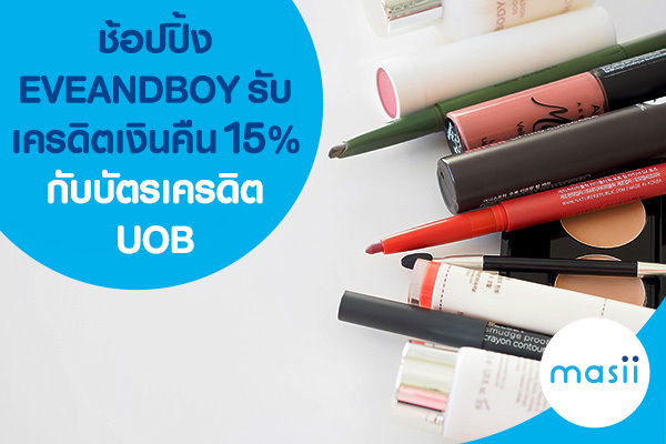 ใครที่ชื่นชอบบิวตี้ไอเทม ไม่ว่าคุณจะเป็นหนุ่มสาวหน้าใส สายฝอ สายเกา หรือคนที่รักการดูแลตัวเองด้วยผลิตภัณฑ์บำรุงผิว ผลิตภัณฑ์บำรุงหน้า สุขภาพ และความงาม รวมไปถึงเครื่องสำอางสารพัดยี่ห้อดังก็ไปจัดเต็มในการช้อปปิ้งที่ EVEANDBOY กันได้เลย แถมยังได้เครดิตเงินคืน 15% เมื่อรูดซื้อสินค้าผ่านบัตรเครดิต UOB ด้วยนะ ตาม masii ไปตำไอเทมใหม่กันเลยค่ะ