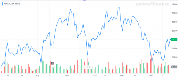Advanced Info Service Public Company Limited shareholders saw gains overall during the trading day. Shares of SET: ADVANC, closed the Monday December 23, 2019 trading session with positive gains of 1.85%, closing at 220.0 THB per share. Shares gained 4.0 THB per share over the previous close at 216.0 THB per share.