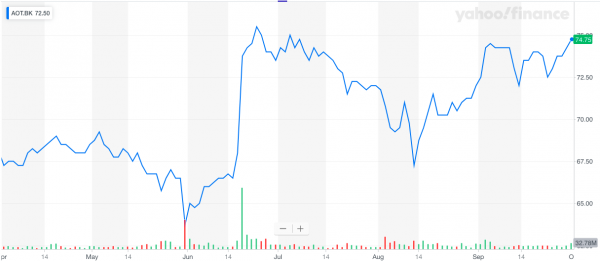 Airports of Thailand Public Company Limited shareholders saw gains overall during the trading day. Shares of SET: AOT, closed the Monday September 30, 2019 trading session with positive gains of 0.67%, closing at 74.75 THB per share. Shares gained 0.5 THB per share over the previous close at 74.25 THB per share.