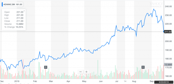 It was a weak trading day for Advanced Info Service Public Company Limited. Shareholders of SET: ADVANC, saw losses during the Monday September 23, 2019 trading session of 4.95%, finishing out the day at 211.0 THB per share. Shares fell 11.0 THB per share from the last close at 222.0 THB per share.