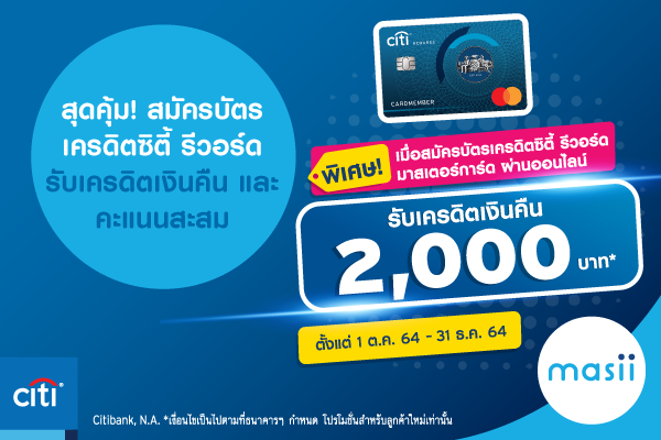 เติมความสนุกให้ทุกการใช้จ่ายเป็นเรื่องง่าย ๆ ไม่ว่าจะอยู่บ้านช้อปป้ิงโปรเด็ด หรือดีลสุดพิเศษผ่านทางออนไลน์ รวมถึงเลือกใช้จ่ายตัวเองที่หน้าร้าน บอกได้เลยว่า บัตรเครดิตซิตี้ รีวอร์ด มาสเตอร์การ์ด สามารถช่วยตอบโจทย์ไลฟ์สไตล์การใช้จ่ายของคุณได้อย่างแน่นอน เอาเป็นว่าใครที่สนใจ สมัครบัตรเครดิต ไว้ใช้จ่าย Masii แนะนำ สมัครบัตรเครดิตซิตี้ รีวอร์ด มาสเตอร์การ์ด เพิ่มความสะดวกสบายยิ่งขึ้นเพียงแค่สมัครผ่านทางออนไลน์ รับเครดิตเงินคืน 2,000 บาท* และคะแนนสะสม 5 เท่า* เมื่อใช้จ่ายออนไลน์