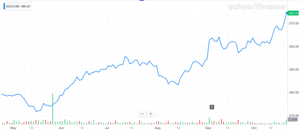 Electricity Generating Public Company Limited shareholders saw gains overall during the trading day. Shares of SET: EGCO, closed the Thursday October 24, 2019 trading session with positive gains of 2.40%, closing at 384.0 THB per share. Shares gained 9.0 THB per share over the previous close at 375.0 THB per share.