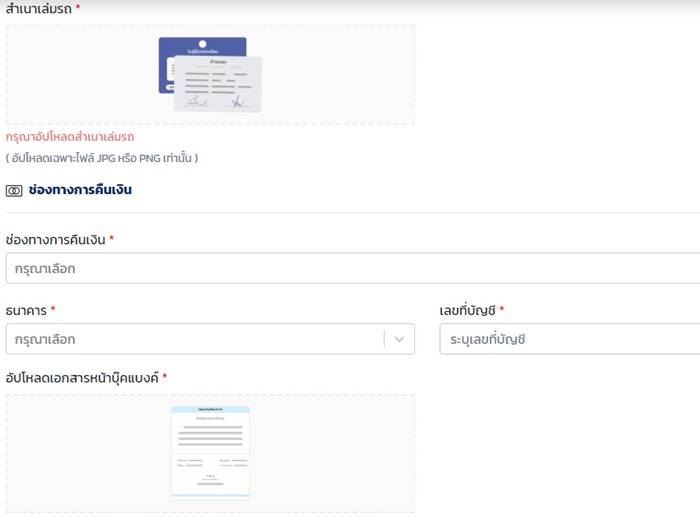 5. กรอกข้อมูลเพิ่มเติมตามที่เว็บไซต์ระบุ และในบางกรณี อาจจะต้องอัปโหลดภาพ “สำเนาเล่มรถ” และ “เอกสารหน้าสมุดบัญชีธนาคาร” ใส่ลงไปด้วย