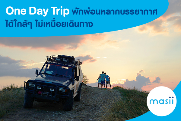 ในสภาพวะเคร่งเครียดทั้งเศรษฐกิจ การเงิน ต่างๆนาๆในปัจจุบัน ส่งผลต่อจิตใจเราทำให้หมดแรงบางครั้ง เกิดความเบื่อหน่าย หรือเกิดความท้อในการจะทำงานหรือลงมือทำสิ่งต่างๆ ซึ่งทางหนึ่งที่หลายคนนึกถึงก็คือ การท่องเที่ยวการพักผ่อนเปลี่ยนบรรยากาศให้ตัวเองได้ชาร์ตแบตเติมพลัง แต่หลายคนก็มองว่าการจะท่องเที่ยวหรือเดินทางไปไหนสักครั้งก็เป็นเรื่องใหญ่ ทั้งการเดินทาง เรื่องที่พัก ก็เป็นค่าใช้จ่ายทั้งนั้น แต่อย่าเพิ่งเศร้าใจไปครับ วันนี้ Masii มีทริปการเที่ยวดีๆแบบ One Day trip มาฝากกันครับ เดินทางไม่ไกล จาก กทม. ลดค่าใช้จ่ายในการท่อเที่ยว แถมได้พักผ่อนเปลี่ยนบรรยากาศ ซึ่งสามารถเลือกได้ว่าชื่นชอบการท่องเที่ยวหรือบรรยากาศแบบไหนครับ