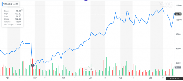 It was a positive trading day for TISCO Financial Group Public Company Limited. During the Wednesday September 25, 2019 trading session, stocks of SET: TISCO, closed the trading session with positive gains of 3.03%. Shares closed up 3.0 THB over the last session when they closed at 102.0 THB per share.