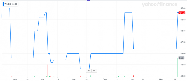 It was a positive trading day for White Group Public Company Limited. During the Monday November 18, 2019 trading session, stocks of SET: WG, closed the trading session with positive gains of 5.48%. Shares closed up 8.0 THB over the last session when they closed at 154.0 THB per share.