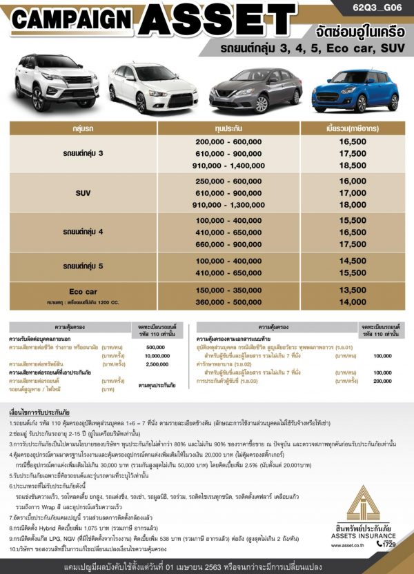 สำหรับ ประกันรถยนต์ชั้น 1 สินทรัพย์ประกันภัย Campaign Asset จัดซ่อมอู่ในเครือ รับประกันรถอายุ 2-15 ปี เฉพาะรถยนต์รหัส 110 กลุ่ม 3,4,5, Eco Car และรถ SUV มีทุนประกันให้เลือกตั้งแต่ 200,000-1,400,000 บาท เบี้ยประกันสุดคุ้ม มีเงื่อนไขและรายละเอียด ดังต่อไปนี้